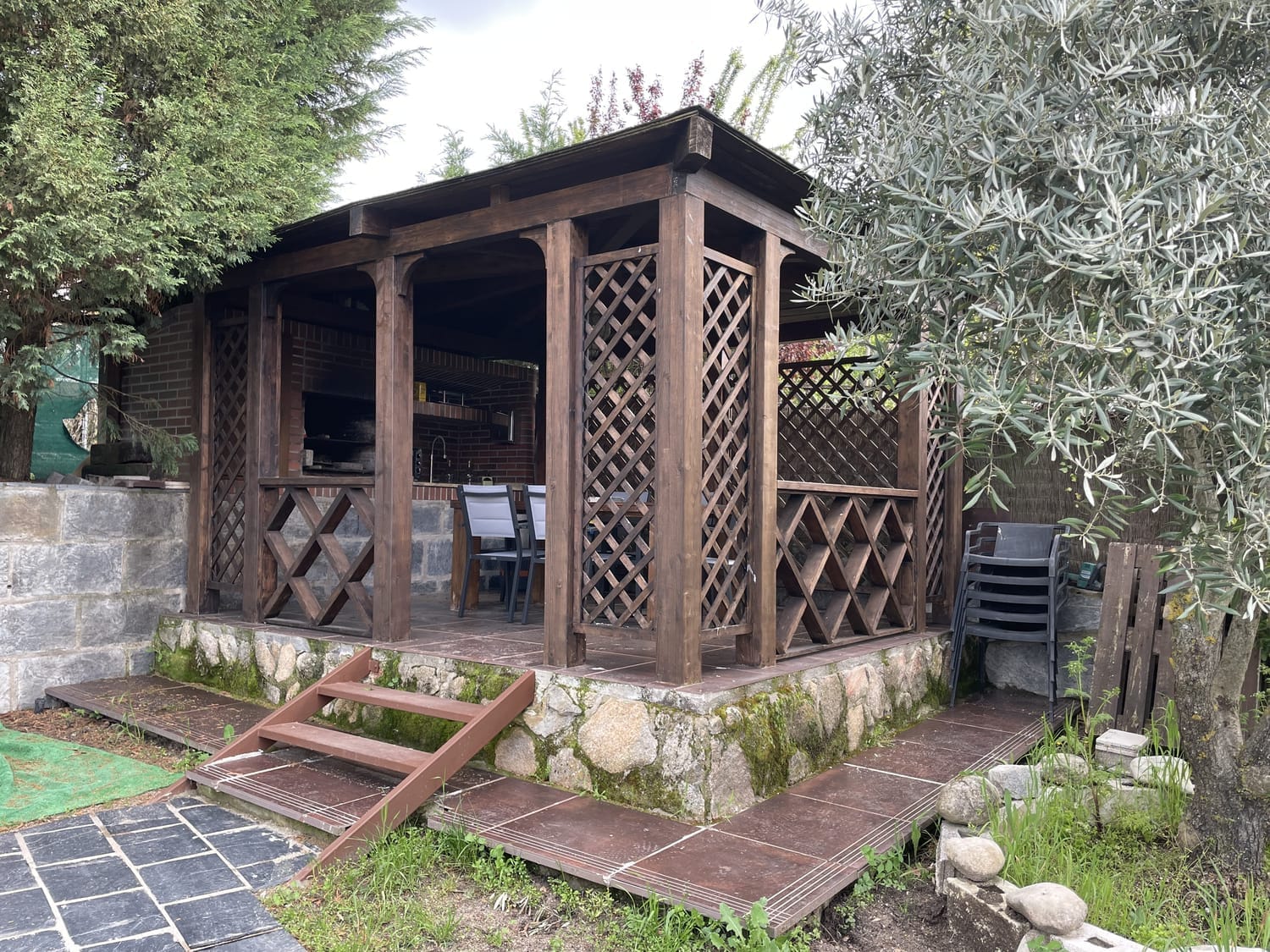 Un amplio jardín con pérgola, ideal para comidas al aire libre, barbacoas o simplemente relajarte al sol.